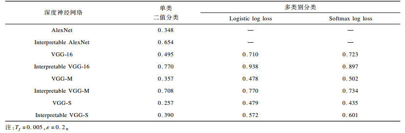 其中, |· |表示集合的大小。当If, c大于某个阈值ε时, 可以认为滤波器f在检测视觉概念c, 即该滤波器f检测视觉概念c的概率为Pf, c=Ex1(If, c>ε)。值得注意的是, 一个滤波器可能检测多个视觉概念, 需要选择得分最大的视觉概念, 即Pf=maxcPf, c。检测到的视觉概念数量可作为网络层可解释性的衡量标准, 因为它更好地衡量了出现的可解释概念的多样性和覆盖范围。