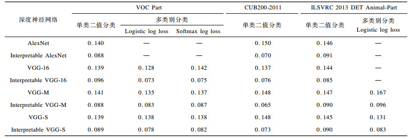 下载CSV 表 3 VOC Part数据集上CNN滤波器可解释性Pf均值 Table 3 Mean interpretability Pf of CNN filters on VOC Part dataset |