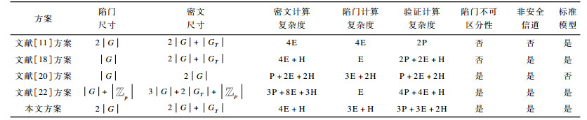 3.3 性能比较将文献[11, 18, 20, 22]中的可搜索加密方案与本文方案的陷门和密文的尺寸、各算法的计算复杂度以及是否具有陷门的不可区分性等信息进行对比, 令|G|、|GT|、|
