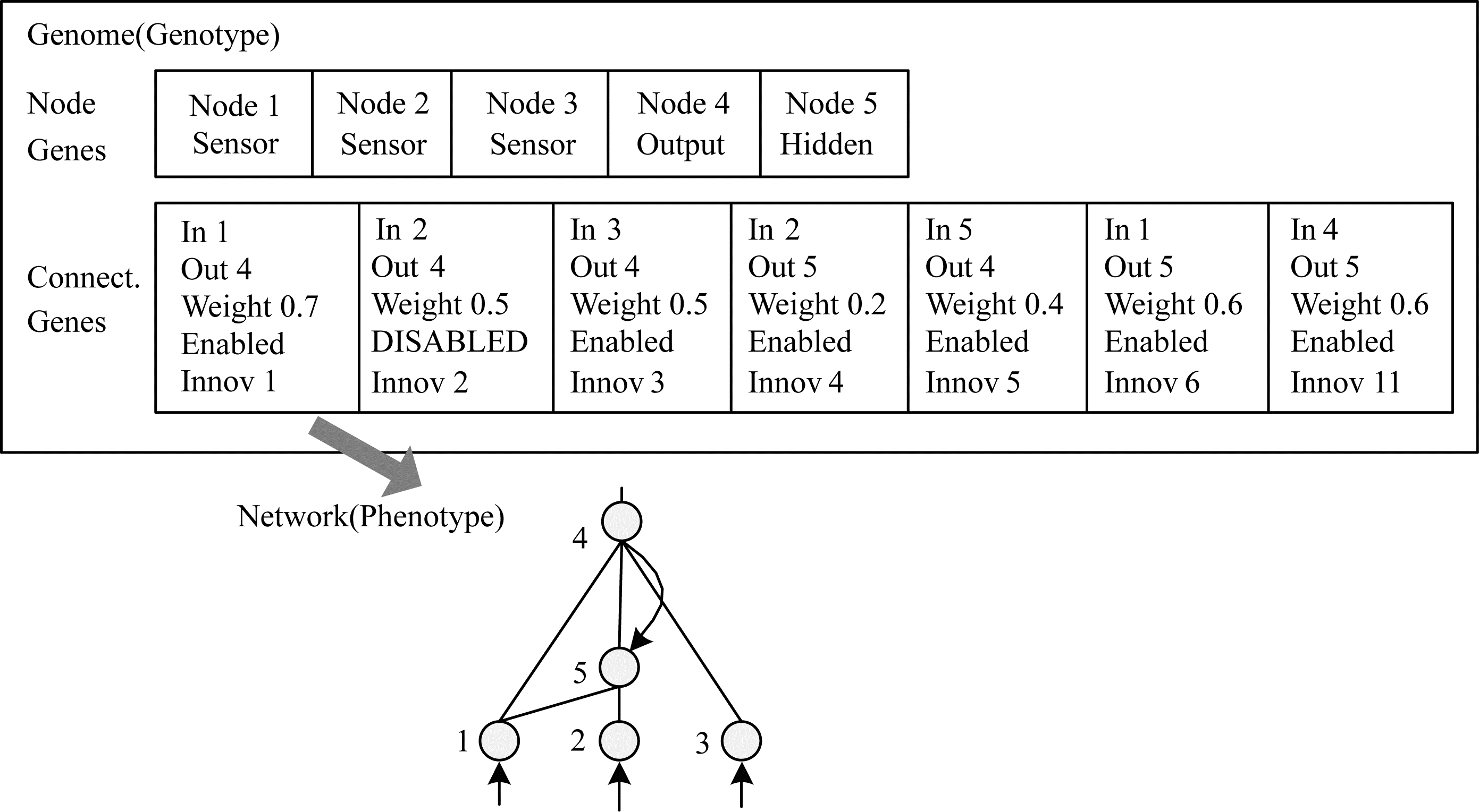 | 图 3 神经网络在NEAT中的表现形式 Fig. 3 Representation of neural network in NEAT | |