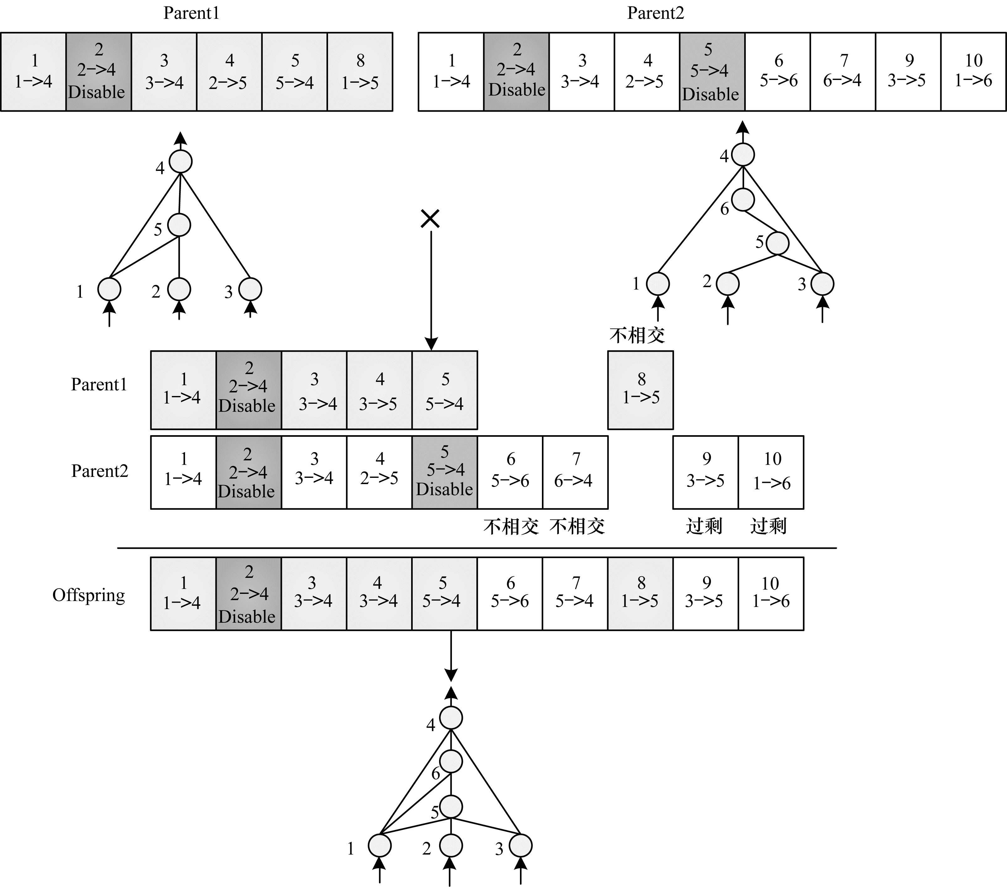 | 图 5 NEAT的神经网络交叉方式 Fig. 5 Neural network cross mode of NEAT | |