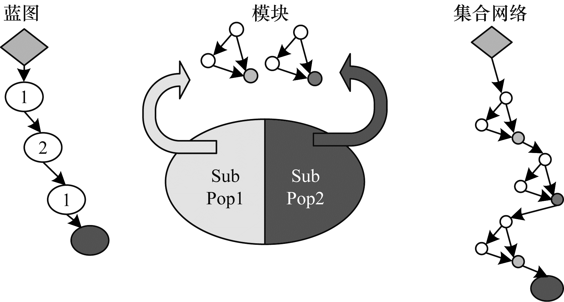 CoDeepNEAT算法和DeepNEAT算法采用相同的进化方法, 但是CoDeepNEAT算法同时进化2组蓝图和模块, 并且采用共同进化的方式, 通过用相应的模块替换蓝图节点, 将模块和蓝图组装成网络, 从而得到一个大型的网络结构, 称为集合网络。