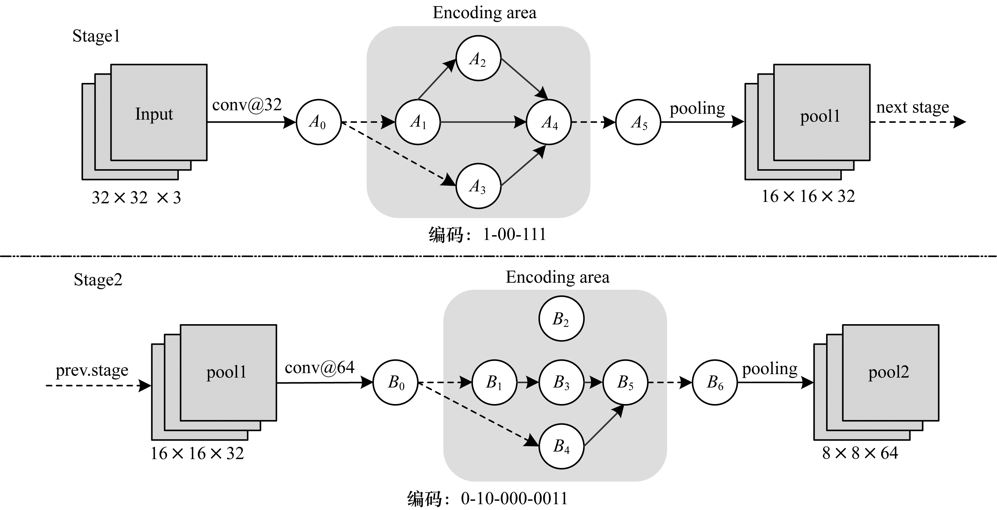 (2) 普通节点。除默认节点外的节点称为普通节点, 即图 7中编码区域中的节点, 它们的节点序号唯一且有序。同一Stage中的所有卷积操作具有相同的卷积核和通道数量。