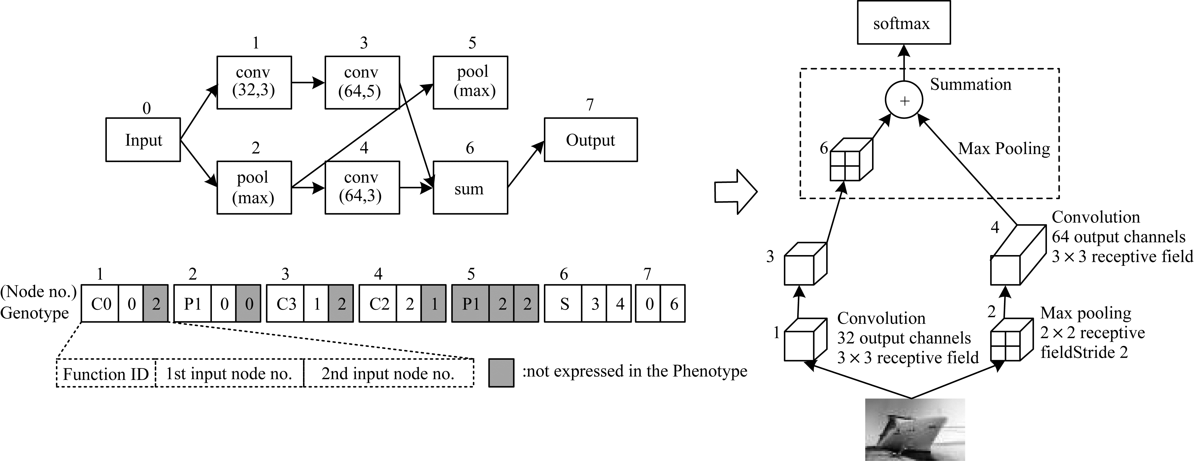 图 9所示为一种CGP-CNN的编码方式, 其中左边是Genotype, 右边是CNN架构图, 节点5是一个未激活的节点。