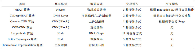 3.5 算法对比与分析前文提到的7种算法对比如表 1所示。NEAT算法的基本单元为神经元(Neuron), 采用链表的方式进行编码, 有增加连接、增加节点和修改权重3种变异方式, 在进行交叉操作时, 根据Innovation ID决定采用交叉操作的2个基因序列。CoDeepNEAT算法的基本单元为DNN Layer, 采用实数编码和二进制编码2种编码方式, 并且有改变连接和改变节点2种变异方式, 在交叉操作阶段, 根据历史标记确定2个基因排列方式。Genetic CNN算法的基本单元是通过Block方式构造的CNN结构, 采用二进制编码, 根据每个个体的概率进行变异和交叉。CGP-CNN算法的基本单元与Genetic CNN算法相同, 都是通过Block方式构造的CNN结构, 采用的变异方式为强制变异和中性变异, 没有交叉操作。Large-Scale算法和Better Topologies算法的基本单元都为Node, 编码方式分别采用DNA Graph和整数编码, 分别为11种变异方式和5种变异方式, 都没有交叉操作。Hierarchical Representation算法的基本单元是由一个三级结构表示的有向无环图, 这个有向无环图包括3个节点(特征图), 每2个节点的边有6种基本操作可供选择, 在进化过程中包括增加连接、修改连接和删除连接3种变异方式, 没有交叉操作。