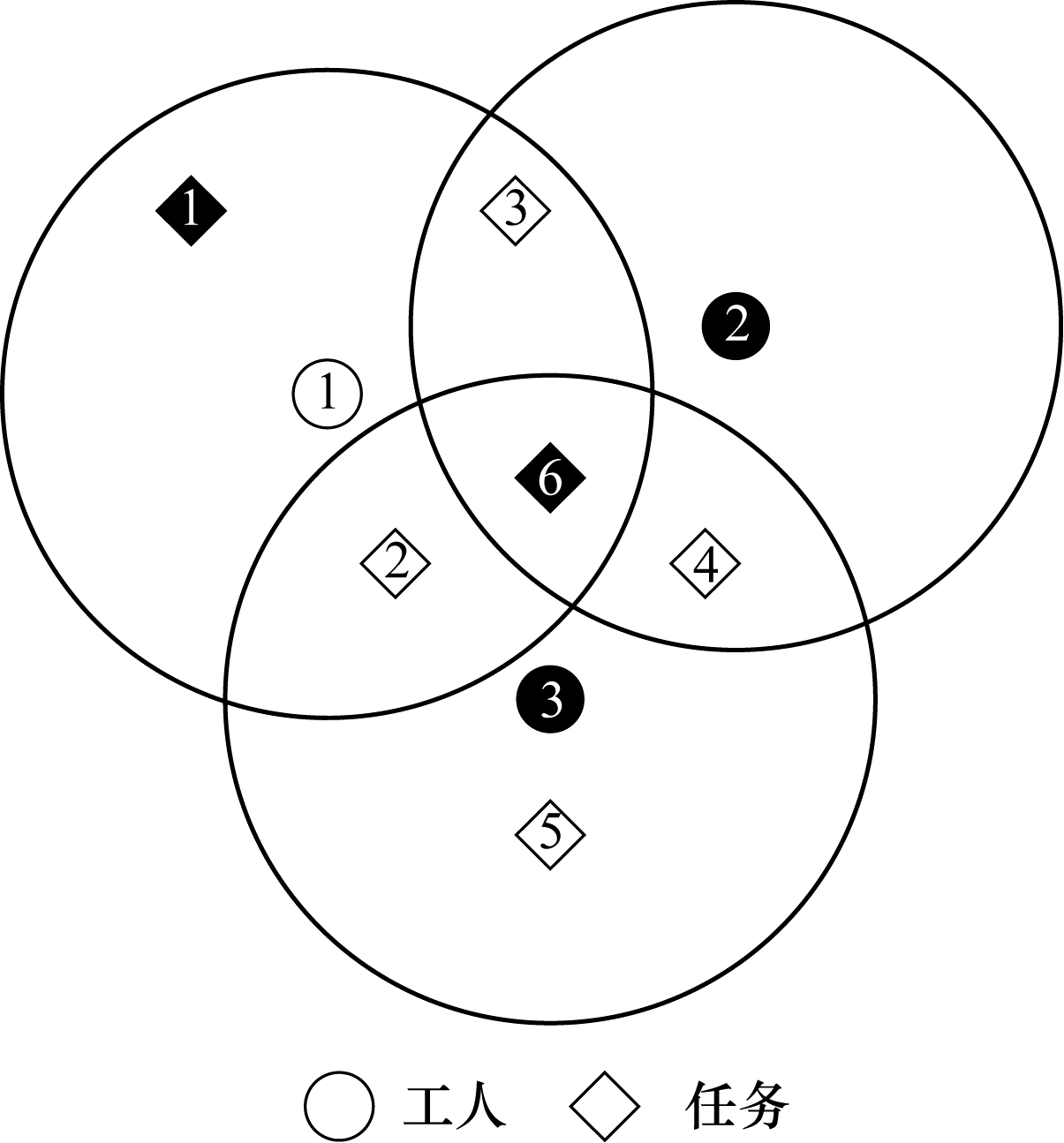 | 图 1 某个时间片内的工人和任务集合 Fig. 1 Worker and task sets in certain time slice | |