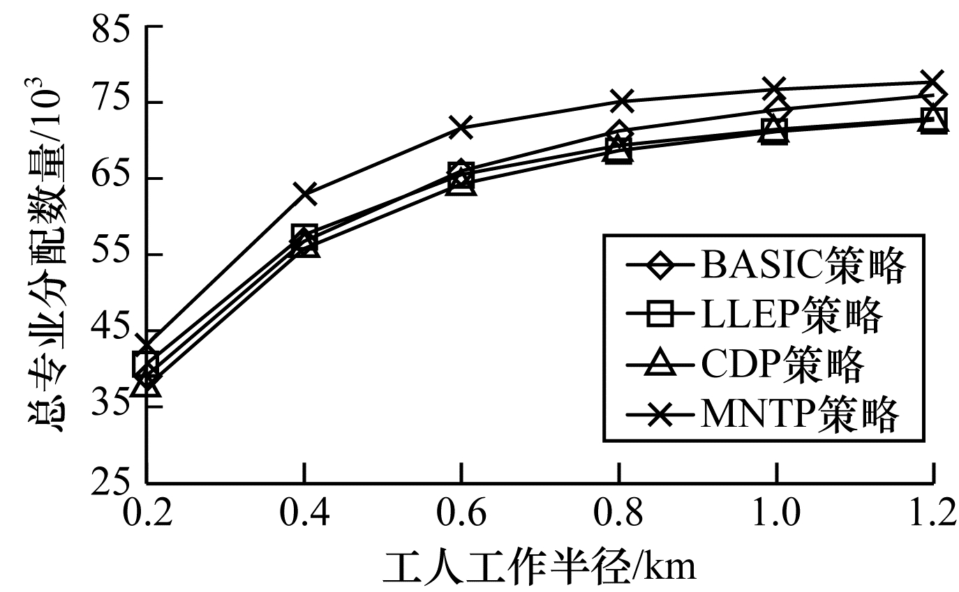 | 图 10 工人工作半径对不同策略总专业分配数量的影响 Fig. 10 The effect of worker working radius on the number of total expertise allocation of different strategies | |