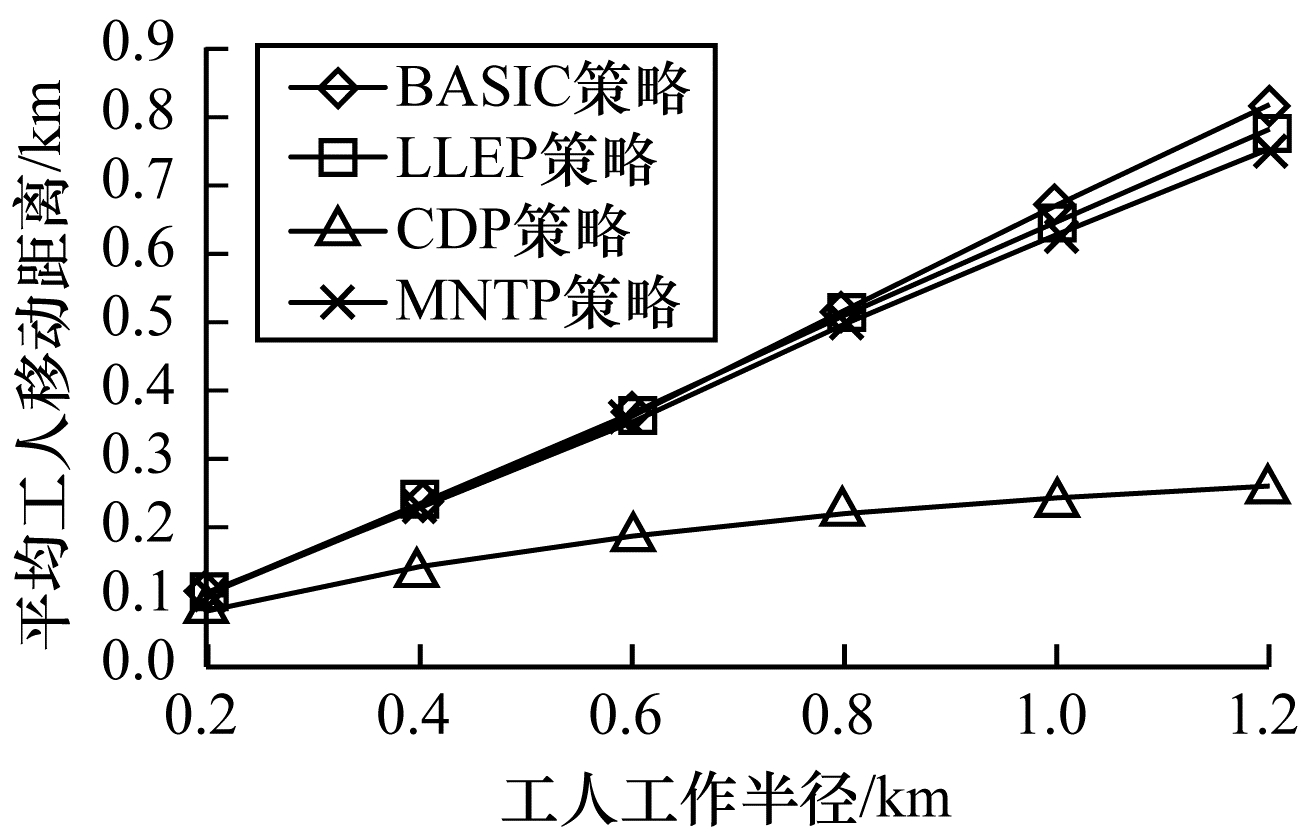 | 图 11 工人工作半径对不同策略平均工人移动距离的影响 Fig. 11 The effect of worker working radius on average worker moving distance of different strategies | |