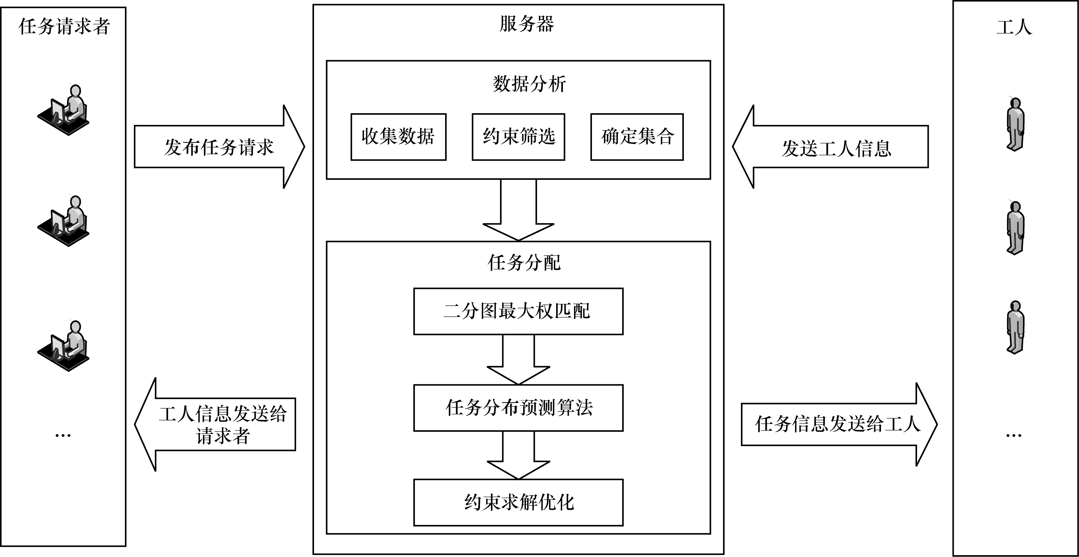 由于在每个时间片内工人和任务均为静态, 因此将任务分配转化为静态任务分配问题, 而解决该问题的最佳方法是将最大分数任务分配问题转化为二分图最大权匹配问题。