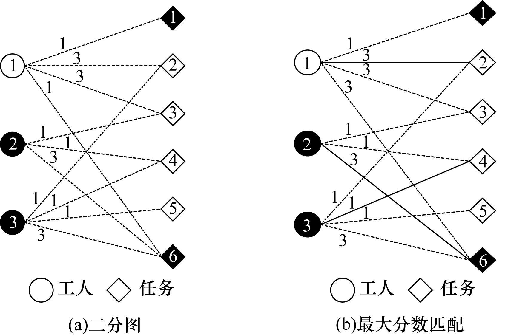 | 图 3 二分图及其最大分数匹配结果 Fig. 3 Bipartite graph and its maximum score matching result | |