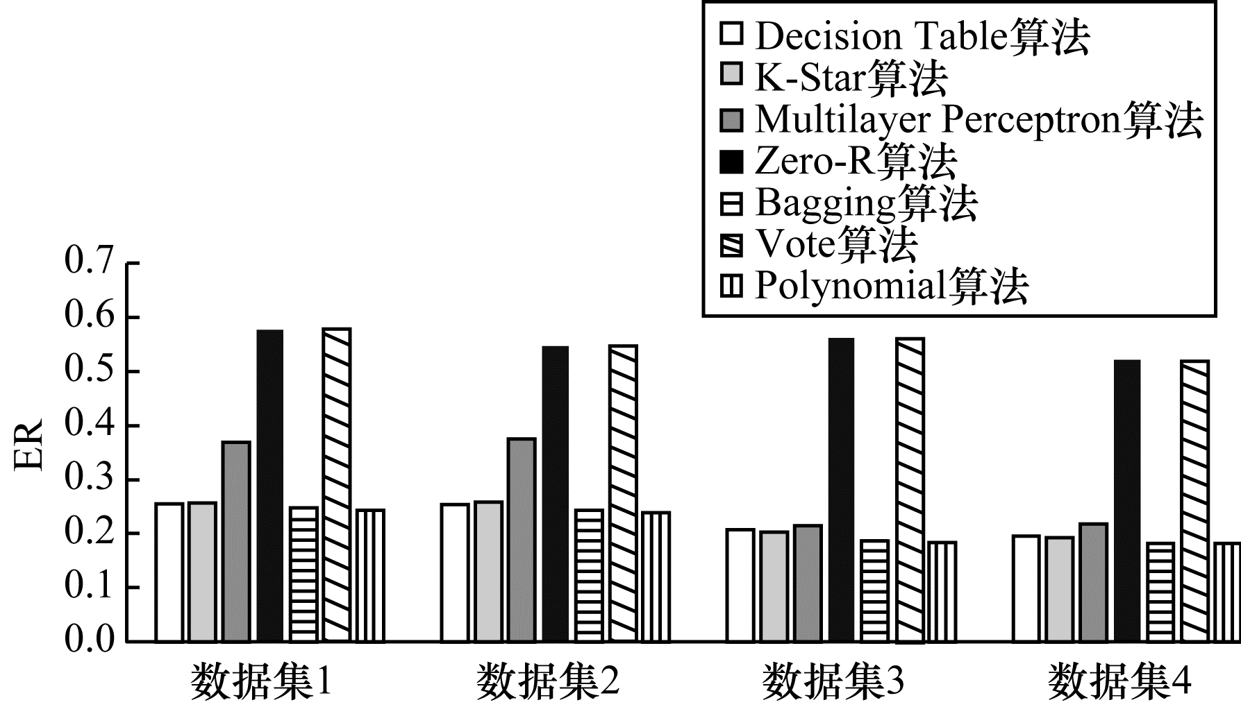 | 图 4 不同数据集下7种算法的错误率对比 Fig. 4 Comparison of ER of seven algorithms under different datasets | |