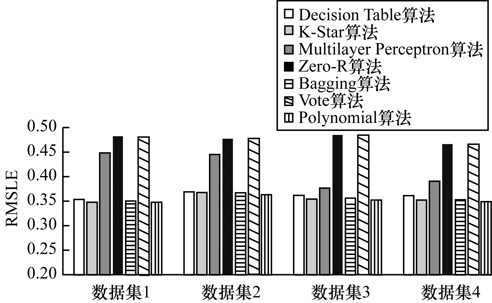 | 图 5 不同数据集下7种算法的均方根对数误差对比 Fig. 5 Comparison of RMSLE of seven algorithms under different datasets | |