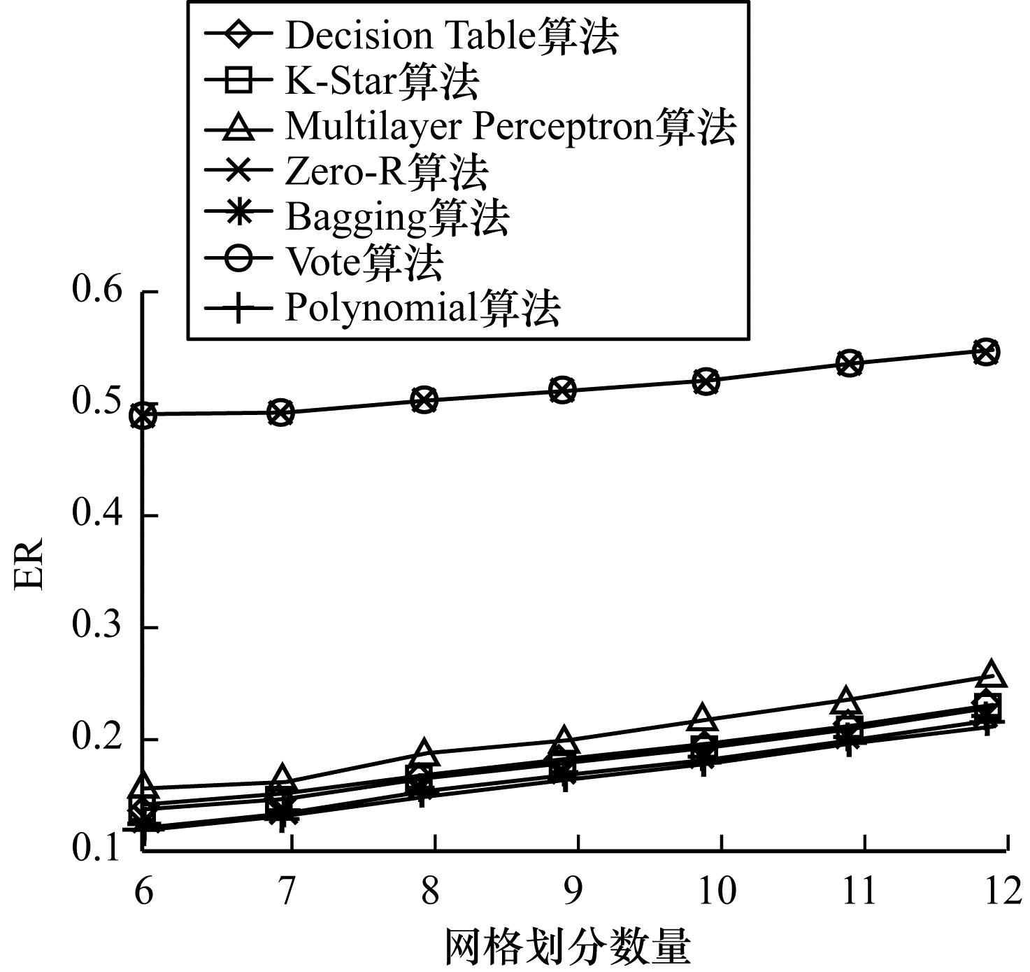 | 图 6 不同网格划分数量下7种算法的错误率比较 Fig. 6 Comparison of ER of seven algorithms with the number of different grid partition | |
