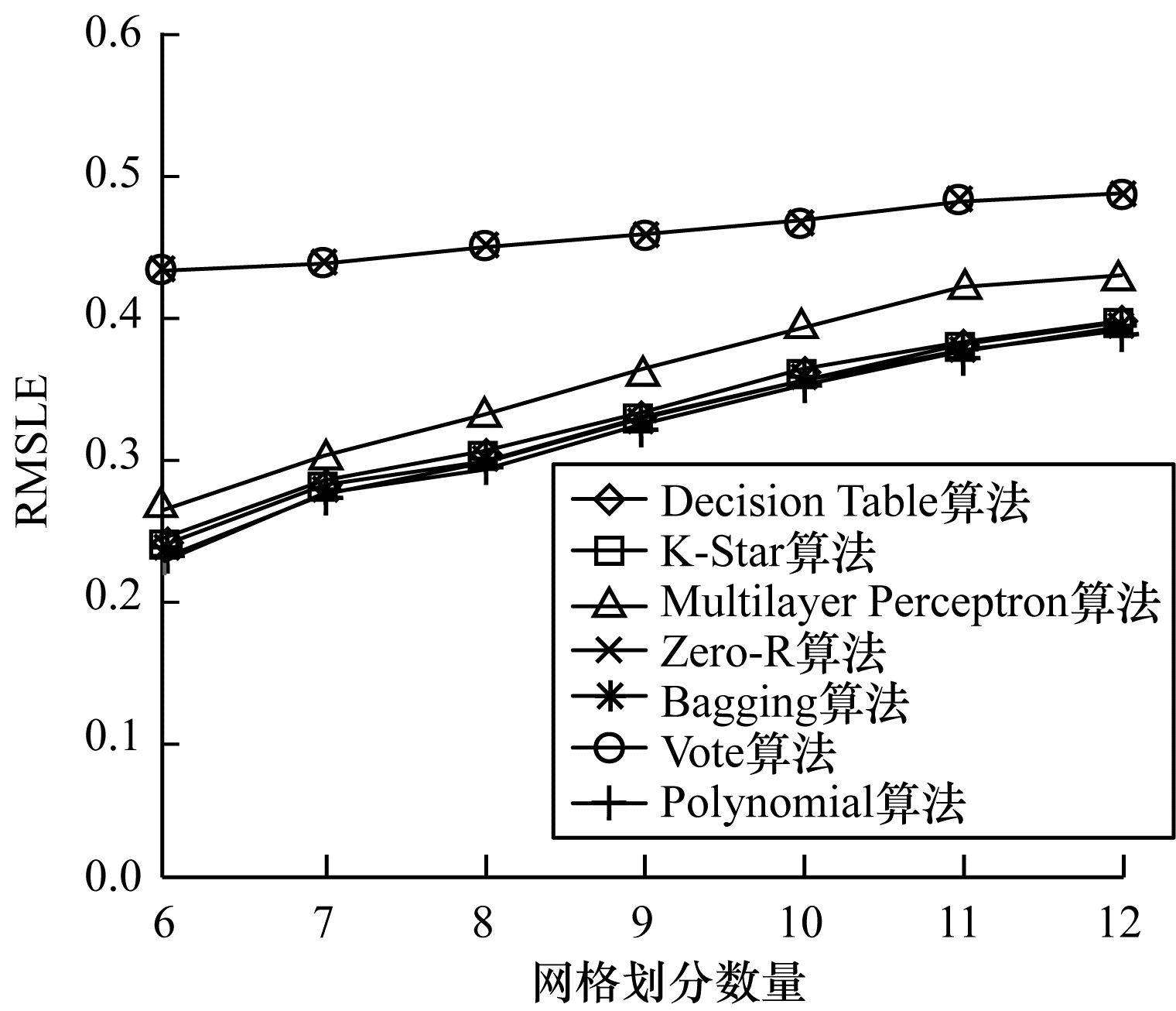 | 图 7 不同网格划分数量下7种算法的均方根对数误差对比 Fig. 7 Comparison of RMSLE of seven algorithms with the number of different grid partition | |