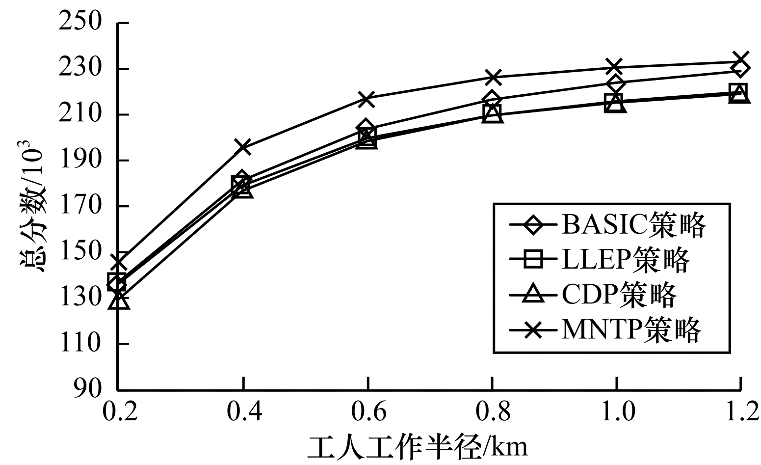 | 图 8 工人工作半径对不同策略总分数的影响 Fig. 8 The effect of worker working radius on total score of different strategies | |