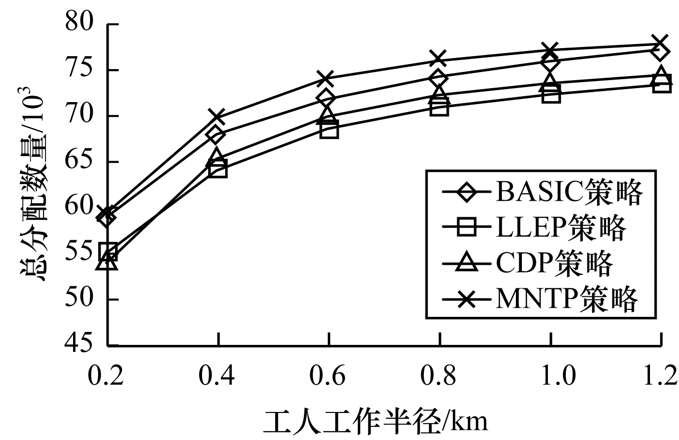 | 图 9 工人工作半径对不同策略总分配数量的影响 Fig. 9 The effect of worker working radius on the number of total allocation of different strategies | |
