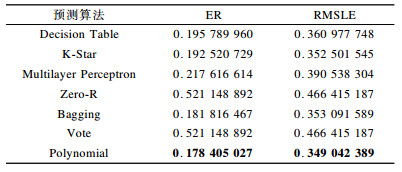 5.1 预测实验在预测实验中, 本文使用常见的Decision Table、K-Star、Multilayer Perceptron、Zero-R、Bagging、Vote、Polynomial等预测算法进行对比实验, 评价标准具体如下: