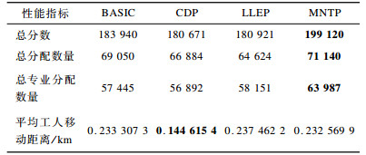 5.2.1 不同任务分配策略对分配结果的影响实验该实验给出了相同参数和数据集下BASIC、CDP、LLEP和MNTP策略在不同评价标准下的任务分配性能比较情况, 如表 2所示, 其中最优结果加粗显示。可以看出, MNTP策略在总分数、总分配数量和总专业分配数量上相对于其他策略约分别能提高11 %、10 %和11 %, 该实验结果验证了上文理论分析的正确性以及MNTP策略的有效性。