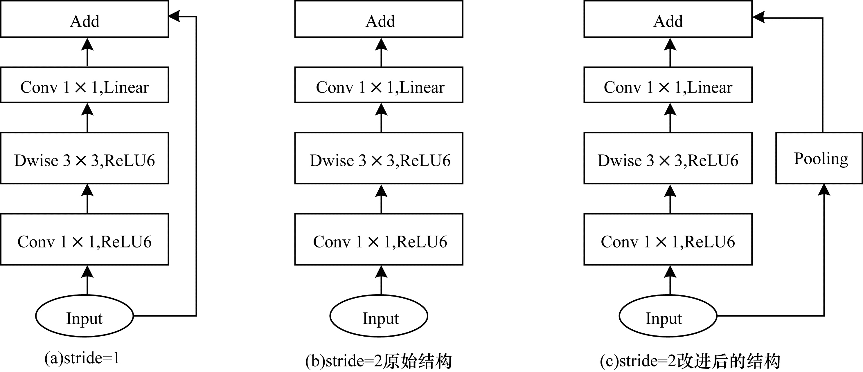 原始的倒残差结构在输入尺寸与深度卷积后的尺寸相同的情况下直接合并通道,若两者尺寸不同则直接采用卷积后的特征作为下一模块的输入,这在一定程度上损失了图像特征。为了最大限度地避免图像特征的丢失,本文对输入尺寸与深度可分离卷积后的尺寸不同的情况做了改进,即将输入的尺寸经过池化变换后生成与深度可分离卷积输出尺寸相同的特征图,然后将两者合并,作为下一次卷积的输入。改进前后的倒残差结构在2种情况下的结构如图 3所示。图 3(a)表示当卷积的步长stride=1时的情况,即直接将输入与卷积之后的输出合并;图 3(b)是原始倒残差结构卷积步长为stride=2时的情况,即直接将卷积后的输出作为下一卷积的输入;图 3(c)是卷积步长stride=2时改进后的结构,将原始的输入进行池化操作后与卷积后的输出进行合并。