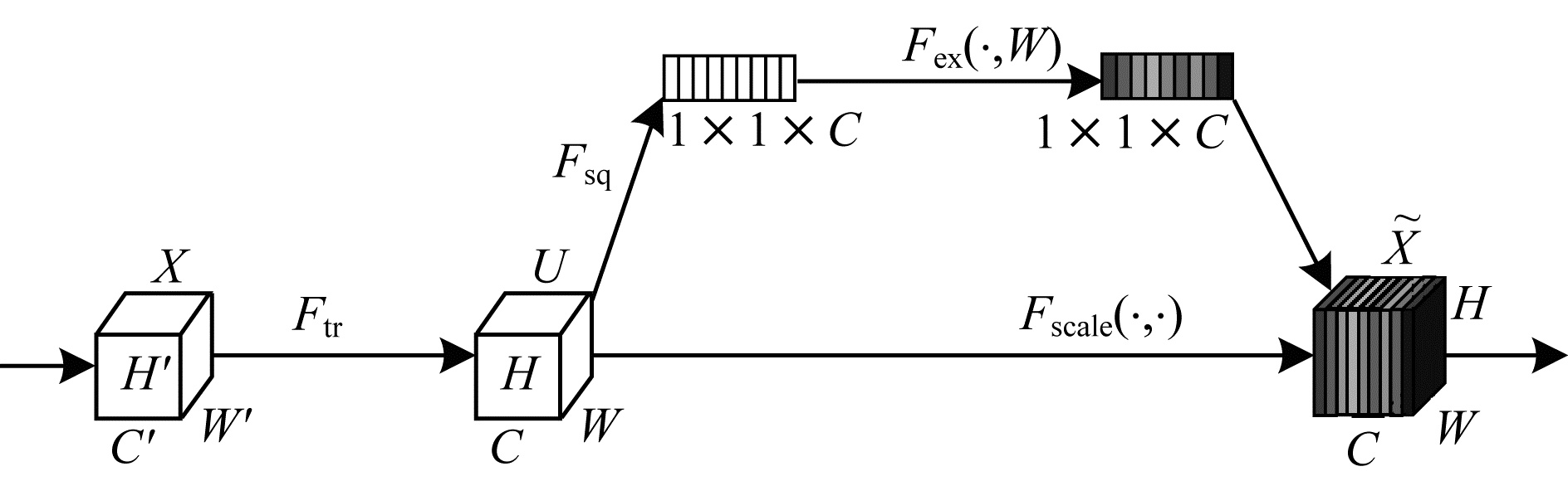 2.4 Squeeze-and-Excitation结构Squeeze-and-Excitation结构由HU等[12]提出,该结构能够学习图像通道之间的关系。图 4所示为Squeeze-and-Excitation模块详细结构,