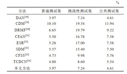 从表 1的数据可知,本文方法在所有列出的关键点定位方法中仅次于DAN算法的结果,但是本文方法的模型简单,参数数量少于DAN。