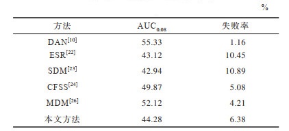 为评估提出算法的稳定性,在300 W的专用的私有测试集上对人脸内部关键点的平均误差、AUC0.08和失败率进行评估,与先进方法的比较如表 4所示。