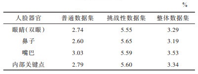 从对人脸的关键器官的关键点定位可以看出,在普通数据集上这3个器官的定位误差比最先进的算法误差还要小,在挑战性数据集上,只比DAN的结果稍差一点,在整体数据集上的测试结果都优于其余方法。由此推断出本文算法的较大误差存在于人脸外轮廓的定位上,因此本文算法适用于对眼睛鼻子嘴巴定位精度较高且对人脸外轮廓定位精度相对不高的人脸任务中。