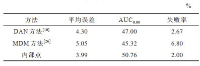 从表 4的数据可知,在仅对内部51个关键点进行评估时,AUC0.08的值要远高于最好的算法DAN的AUC0.08值,失败率比DAN算法降低了0.67个百分点,比MDM方法降低了4.8个百分点,说明本文设计的方法有良好的关键点定位效果。表 4中的结果与在300W公共数据集上的得到的结论一致,说明了本文设计算法的有效性和稳定性。