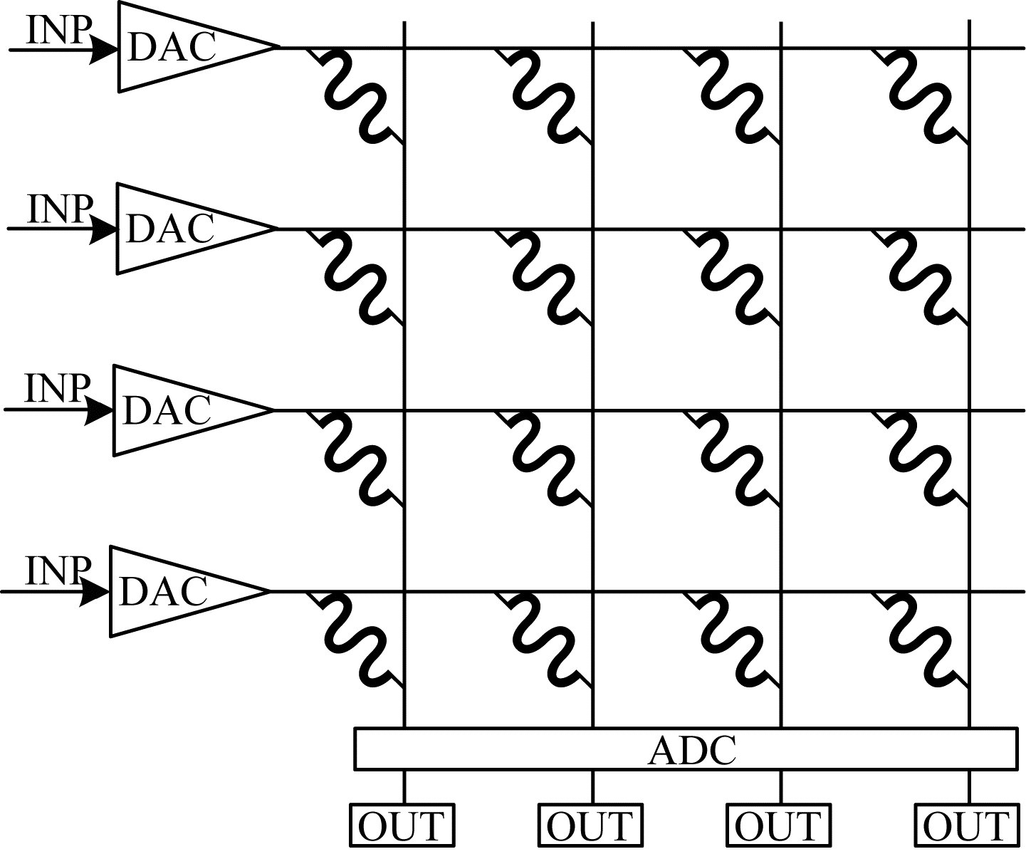 1 面向存算一体加速器的架构和指令集分析 1.1 忆阻器阵列的计算特性忆阻器阵列集成计算和存储功能,一般通过非易失性阻变随机访问存储器(Resistive Random Access Memory,ReRAM)[7]实现。在神经元结构中,突触可以根据其两端的神经元激励发生变化。在忆阻器阵列中,可在ReRAM器件两端外加电压改变电导[8]进行神经计算。如图 1所示,利用ReRAM器件的特性,可以外加输入数字电压(INP),将电压进行数模转换(DAC)得到模拟电压值,加在器件两端的模拟电压和器件预编程的电导通过欧姆定律和基尔霍夫定律计算得到流出器件的电流,将电流值进行模数转换(ADC)后得到计算的数字输出结果(OUT),实现存算一体的功能。