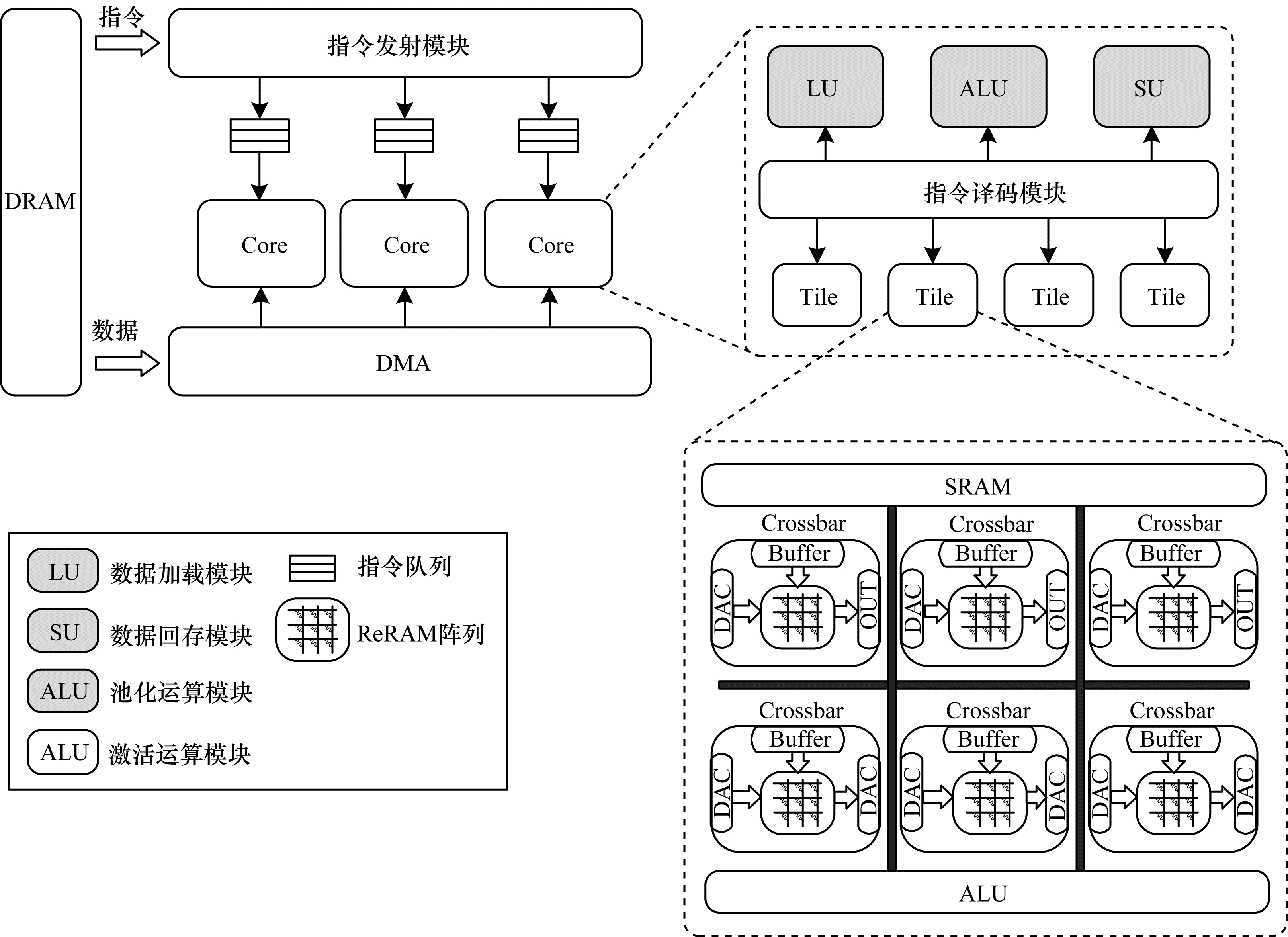 如图 2所示,Crossbar主要进行向量和矩阵的乘法运算,每个Crossbar包含ReRAM阵列、保存输入输出数据的缓存单元、信号转换器等功能模块。Tile主要进行神经网络的层级运算,包含存放数据的SRAM、一定数量的Crossbar和用于将Crossbar的计算结果进行激活操作的向量运算单元(ALU)。Core中主要进行网络级别的运算,包含指令译码模块、一定数量的Tile、加载数据到各自Tile对应SRAM的数据加载单元(LU)、保存数据到动态随机访问存储器(Dynamic Random Access Memory,DRAM)的数据回存单元(SU)和进行池化操作的向量运算单元。DRAM保存编译产生的指令和数据,每个Core通过各自的指令队列连接在指令发射模块上接收指令,数据通过直接存储器访问(Direct Memory Access,DMA)传递给各个Core。