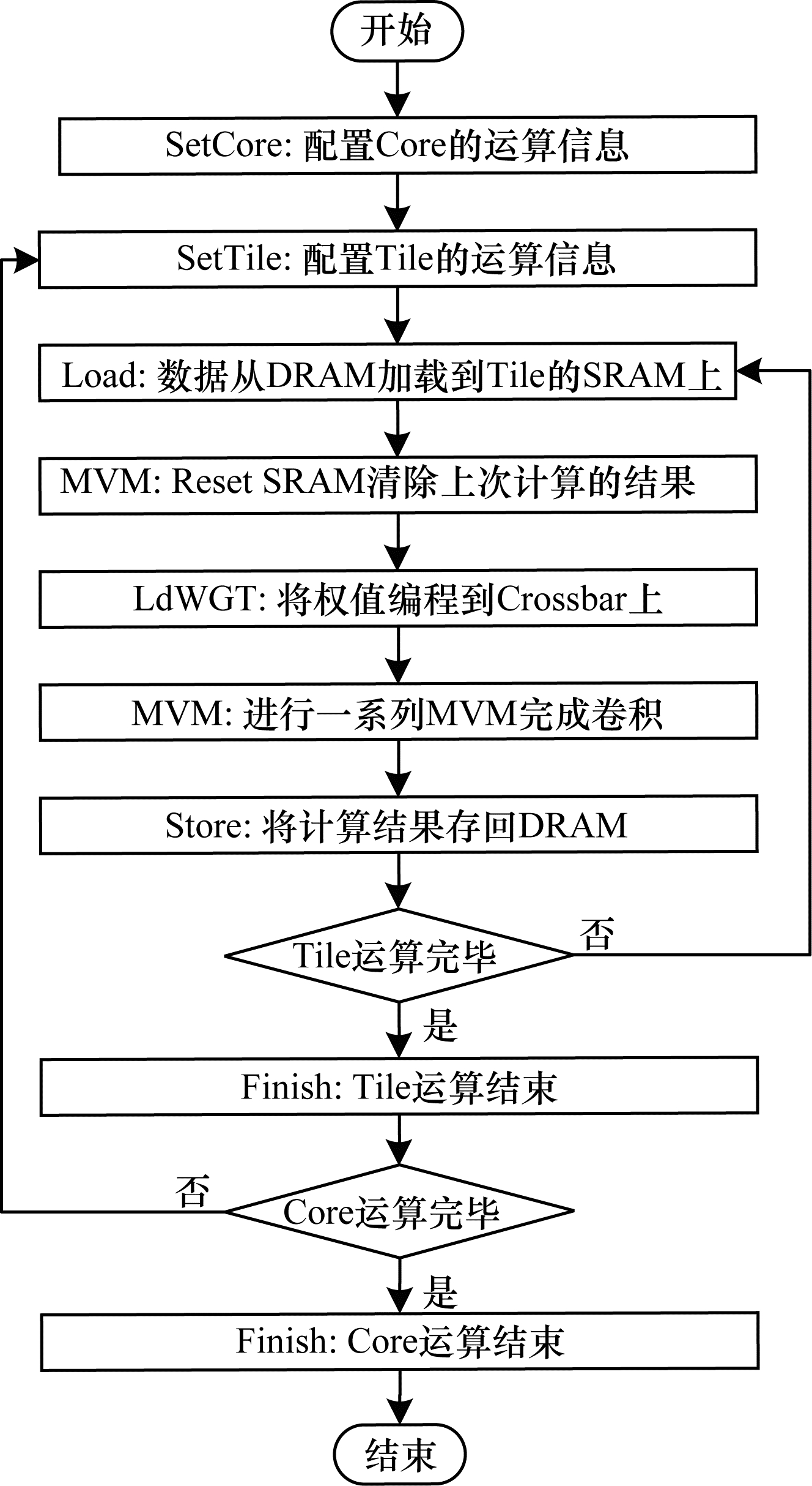 在上述架构和指令集模型下,基于FPGA模拟的阻变神经网络加速器的主要计算流程如图 3所示。