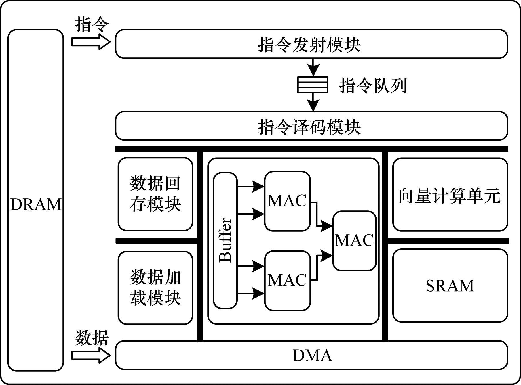 本文设计的加速器包含了阻变神经网络加速器架构的所有主要功能模块,包括DMA、DRAM、指令发射模块、指令队列、指令译码模块、数据加载模块、数据回存模块、SRAM、向量计算单元和向量矩阵乘法运算单元。由于硬件规模的限制,各个Core、Tile、Crossbar的运算任务只能串行进行,阻变神经网络加速器的向量矩阵乘法运算单元主要通过乘累加树实现。对比图 2、图 4中的指令队列接收每个Core的指令并经由指令译码模块发送到各个功能模块中执行。在指令的执行过程中:所有的Tile都通过同一数据加载模块和数据回存模块执行Load、Store指令和SRAM进行交互;所有的MVM指令和ALU指令分别在向量矩阵乘法运算单元和向量计算单元中串行执行。