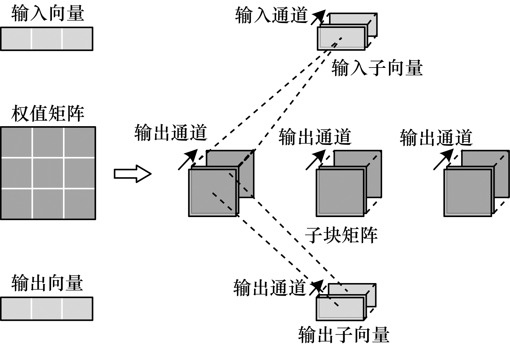 ReRAM阵列的规模一般很大,但FPGA存储和运算资源有限,ALU和MVM指令运算能力有限,因此需要将权值矩阵和输入矩阵进行分割重组,每次进行小规模的运算,将运算结果按照数据索引进行相应的累加。通过对FPGA硬件资源的分时复用完成较大规模ReRAM阵列的模拟。