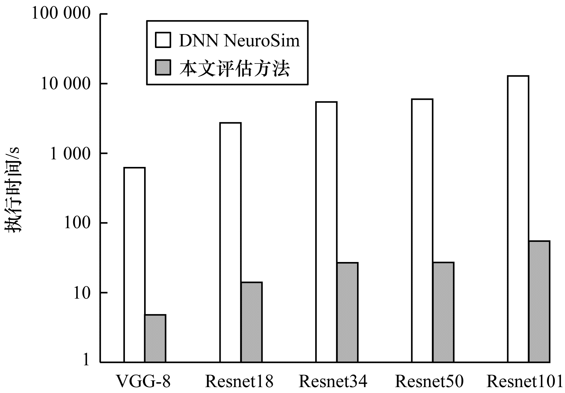为评估加速器对神经网络仿真的加速性能,选取软件模拟器DNN NeuroSim[20]进行对比,为与本文提出的神经网络加速器的功能相匹配,省略了模拟器对功耗和面积的估算。映射VGG-8、Resnet等深度神经网络,并在Intel® CoreTM i5-8500处理器上运行模拟器。图 6给出了对比结果,其中纵坐标的执行时间已经过对数处理,对于小规模神经网络,本文提出的神经网络加速器可以获得129.2倍的加速比。对于深度神经网络Resnet,随着网络层数的提升,本文提出的阻变神经网络加速器评估方法可以获得194.7~234.2倍的加速比。
