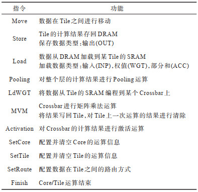 1.3 面向存算一体加速器的指令集分析相较传统神经网络加速器[13],存算一体神经网络加速器将标量计算尽量放在CPU上进行,向量计算的向量规模也无需特殊指定。AMBROSI等[14]于2018年提出一种存算一体神经网络加速器的指令集,相较传统神经网络加速器指令集[15]增加了在不同层次间进行数据搬运的指令,ANKIT等[16]于2020年又加入了进行外积计算的OPA指令及转置矩阵和向量乘法运算的MVTM指令,但不支持对ReRAM阵列的在线编程[17-18]。