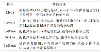 2.2.2 加速器软件库设计由于硬件设计上的差异,表 1所述的指令集不能直接执行在阻变神经网络加速器上。设计C++软件库将表 1中的指令转换为硬件支持的指令,软件库同时支持硬件资源分时复用的软件调度。