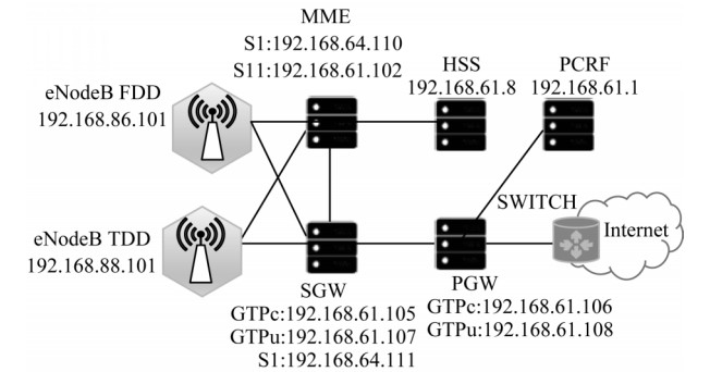 3 实验结果与分析 3.1 环境介绍为避免影响真实用户,本文在实验室搭建的4G网络环境下进行测试,所有设备均来自中兴公司,网络拓扑如图 4所示。模拟用户号段CS:1619800XXXX,VoLTE:1619900XXXX。