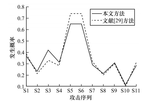 从图 6可以看出,2种方法攻击序列的风险概率有一定差异,主要原因是两者的属性权值计算方法不同。文献[29]方法使用算术平均法对矩阵进行处理,最终