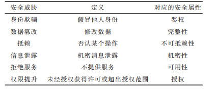 STRIDE模型将常见的安全威胁分成身份欺骗、数据篡改、抵赖、信息泄露、拒绝服务和权限提升6个维度,可以涵盖目前绝大部分的安全威胁,同时,这6个维度与信息安全属性相关。信息安全的3个基本属性[17]是机密性、完整性和可用性,除此之外还包括可靠性、不可抵赖性和可控性等其他属性。STRIDE模型与信息安全属性的对应关系如表 1所示。