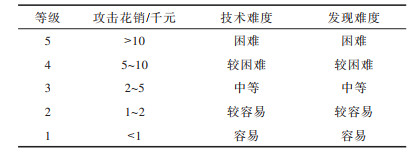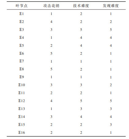 攻击花销以购买设备或软件等花费为参考,技术难度以攻击实施的复杂性为参考,发现难度以漏洞等级为参考。在实际应用中,可以采取专家打分的方式赋值,也可以借鉴通用的漏洞库和漏洞评分系统,如CVE、CVSS等。