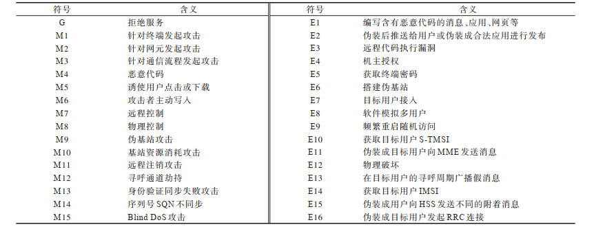 在实验中模拟攻击方时,硬件采用USRP B210,软件使用爱尔兰SRS(Software Radio Systems)公司开发的免费开源LTE框架srsLTE,支持srsUE和eNodeB,可以模拟恶意UE或LTE网络。本文以STRIDE模型中拒绝服务为攻击目标,即以模拟用户服务被拒绝或网络不能正常提供服务为攻击目标,构建攻击树模型,如图 5所示。图 5中各节点符号的具体含义如表 4所示。按照攻击可能发生的位置将威胁分为3种:针对终端发起的攻击,针对网元发起的攻击,针对通信流程发起的攻击,它们是第一级节点。在实验中,终端用的是智能手机,因此,第一种威胁主要是针对智能手机的恶意代码攻击,又可以细分为用户被动触发和攻击者主动控制两类。针对网元发起的攻击包括基站受到的威胁、核心网作为整体受到的威胁和物理层面遭到的破坏。针对通信流程发起的攻击主要利用信令协议,更改协议中消息内容或延迟响应等,破坏正常的通信进程,扰乱会话从而造成安全威胁。