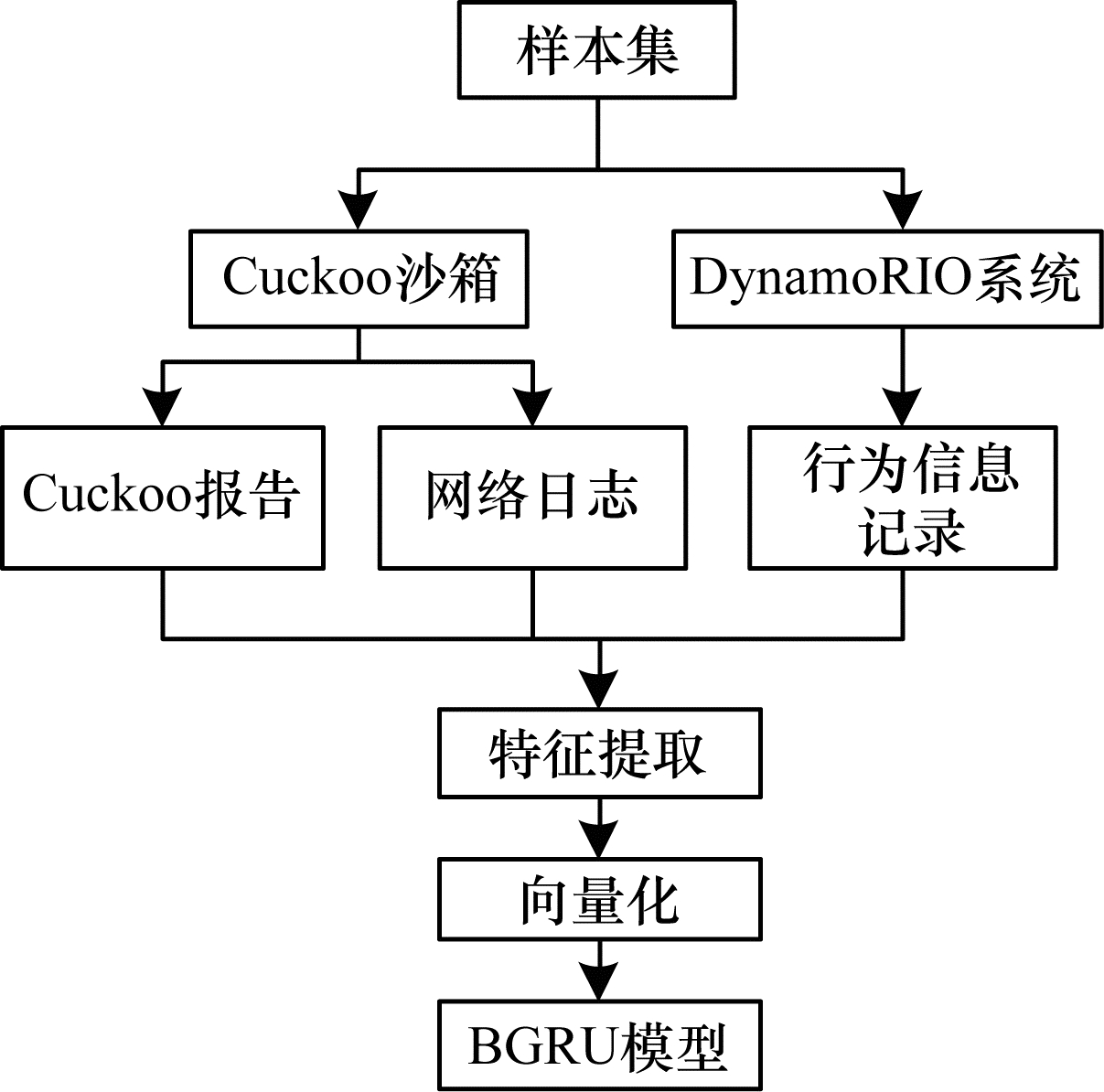 2 本文恶意代码检测方法 2.1 方法流程本文提出一种结合动态行为和机器学习的恶意代码检测方法,其流程如图 1所示。为全面记录恶意代码的行为信息,先构建Cuckoo沙箱和DynamoRIO系统获取动态行为,再针对恶意代码样本的API调用序列与网络行为提取并融合特征,得到对应的特征向量并以此训练BGRU分类模型,从而实现对恶意代码的检测。