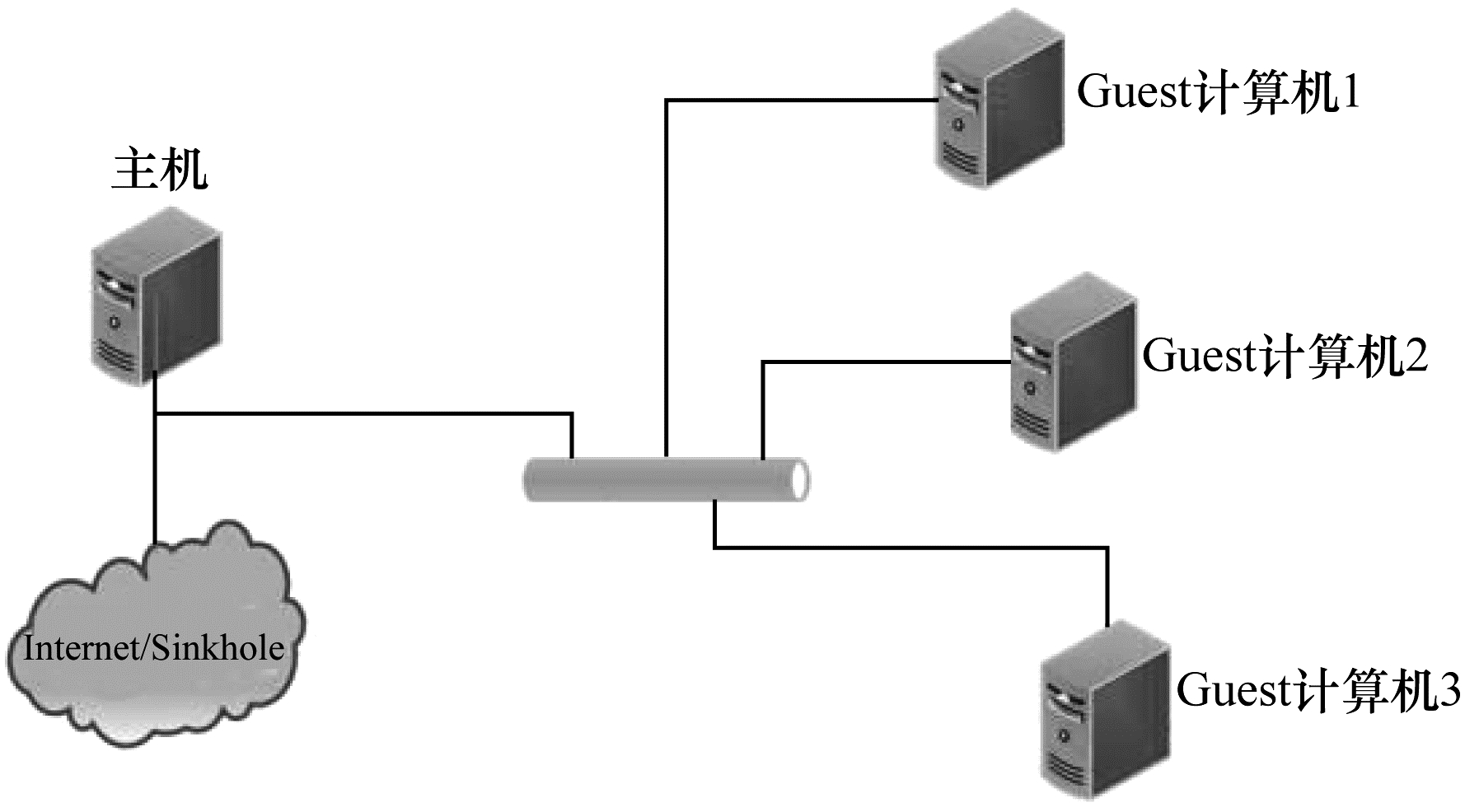 2.2.1 Cuckoo沙箱Cuckoo沙箱是Google公司开发的一个开源的自动化恶意代码分析系统,可分析office文档、pdf文件、可执行文件以及电子邮件等多种文件类型,能用于Windows、Linux和Android等系统的恶意软件检测,其结构如图 2所示。Cuckoo沙箱由一个处于核心位置的主机(中央管理软件)和多个Guest计算机(用于分析的虚拟或物理计算机)组成。主机是沙箱运行的核心组件,主要负责样本执行与分析过程的调度以及Guest计算机的管理。Guest计算机处于隔离环境,每次样本分析都会从一个处于纯净状态的快照开始,可保证恶意代码样本被安全地执行与分析,从而确保分析的正确性,避免多个分析之间的相互干扰。