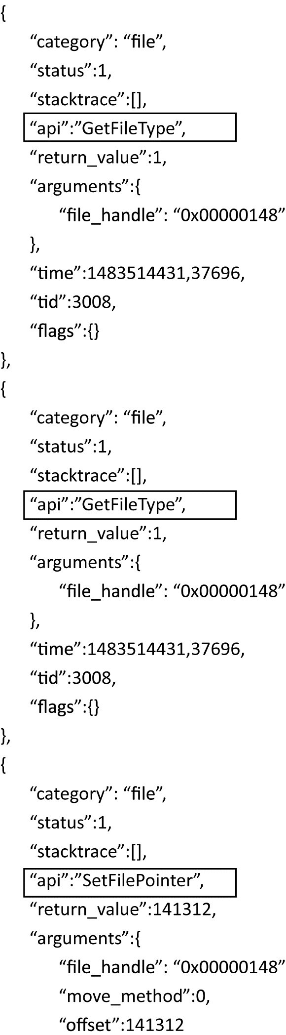 程序在执行过程中会多次循环调用相同的API序列以执行同一命令。由于本文目标是通过提取API调用序列来检测恶意代码,因此无需大量重复的API调用。基于此,本文去掉了冗余的API调用序列,然后将其向量化。图 4为恶意代码样本报告中API提取示例(md5:ffff3f7dad938ac9c8cb2d2d4e25a310)。恶意代码样本根据calls中的API提取序列信息,并重复调用GetFileType(见方框处)。因此,本文将该冗余API信息删除。