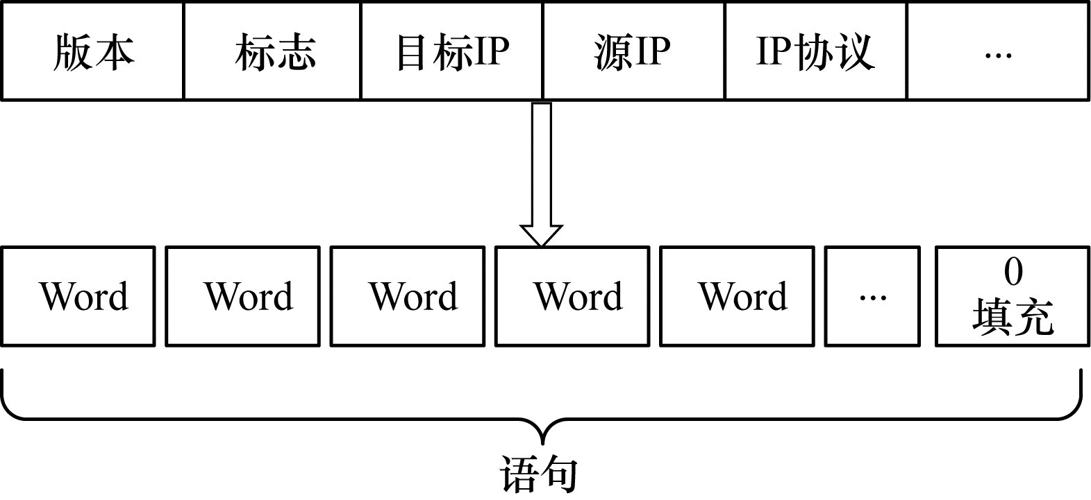 通常,每个数据包的字段为1个字节的数据包头、数据包头的1个字段或者有效载荷的数据块。本文将数据包头中的字段视为1个单词,由于数据包中字段长度不同,因此得到的单词长度也不同。将数据包中字段长度固定为n个字节,如果数据包中字段长度小于n个字节,则将其用零填充,具体如图 5所示。由于大部分TCP数据包含有14个字节的MAC报头、20个字节的IP报头和20个字节的TCP报头[17],因此本文设置n=54。