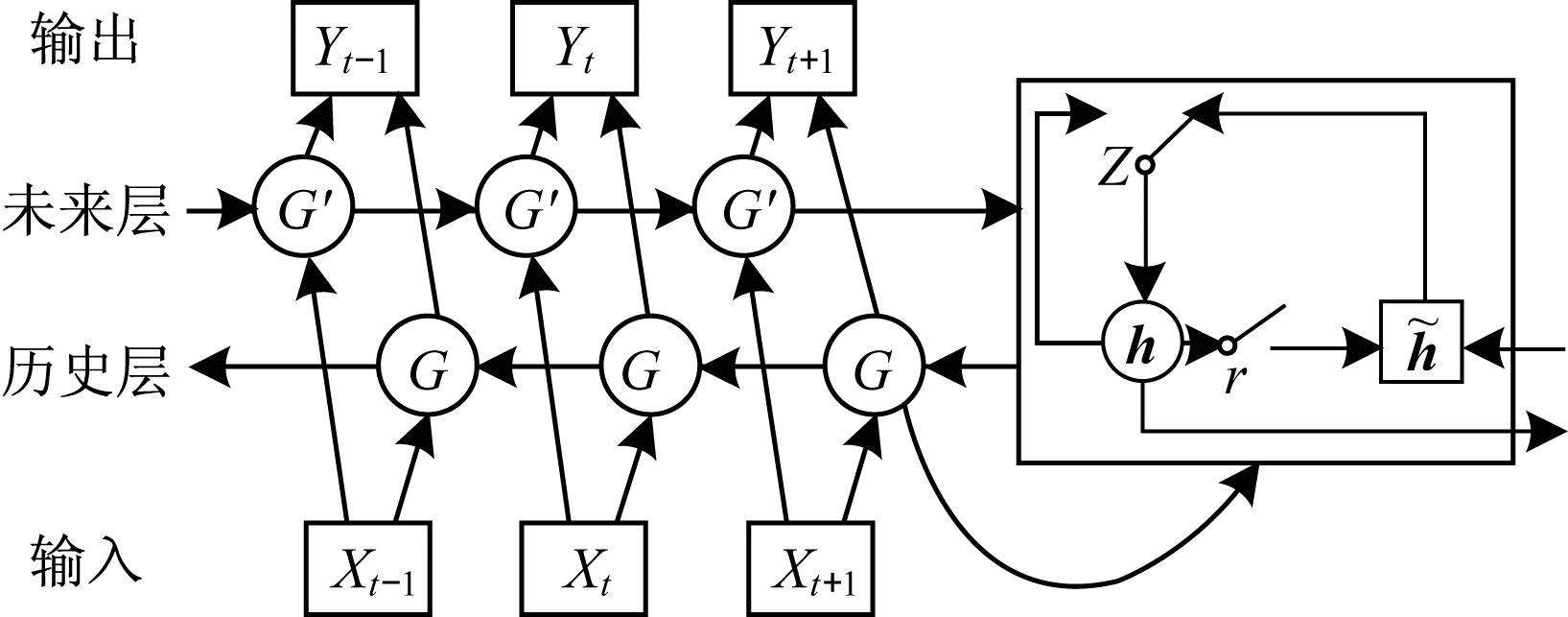 具体而言,两个关键模块构成基于GRU的网络。一个模块是包含第j个GRU隐藏单元且具有相应权重矩阵Wr和Ur的复位门r