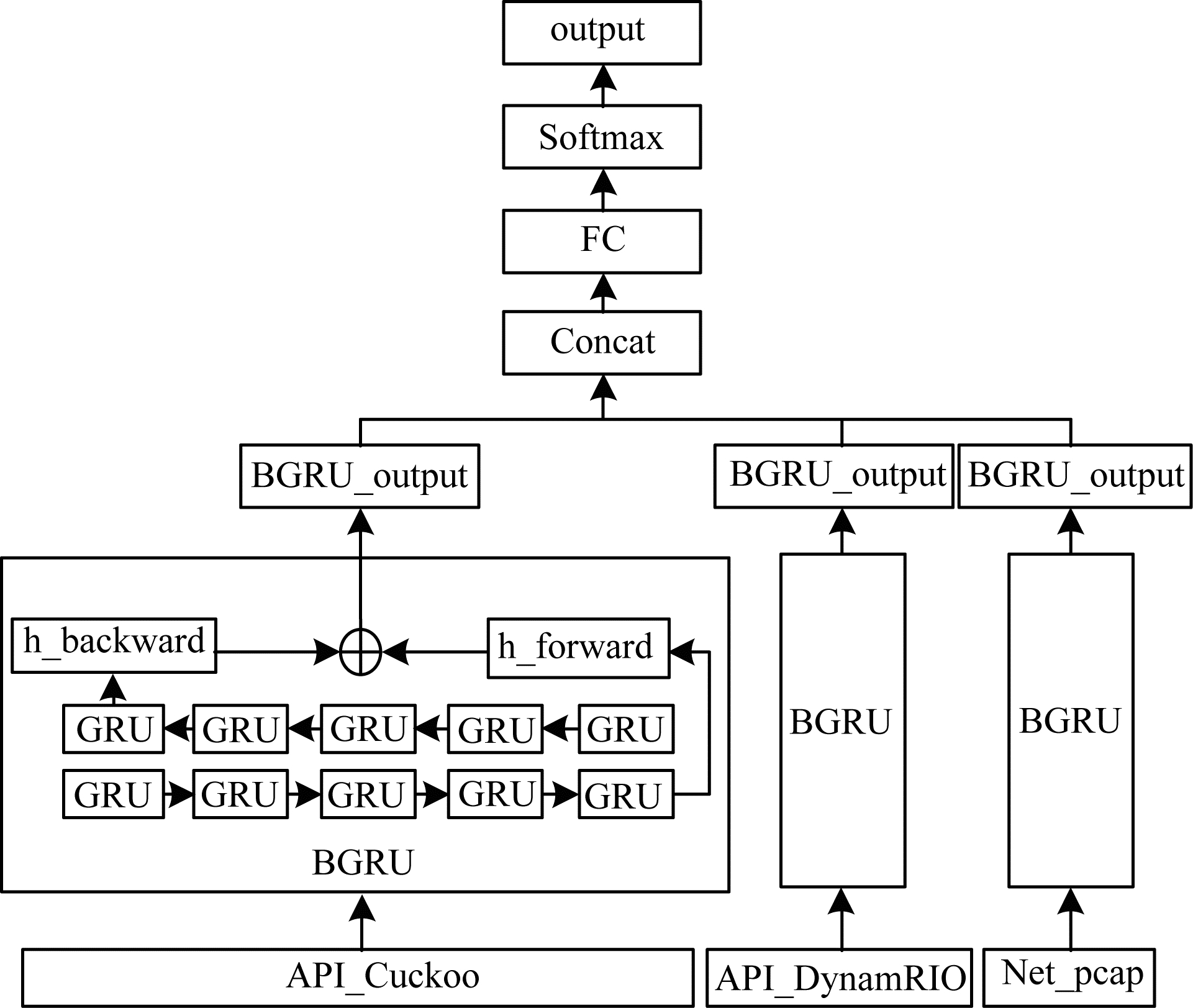 本文通过RNN模型分别学习到API_Cuckoo(从Cuckoo沙箱中提取的API)、API_DynamoRIO(从DynamoRIO系统提取的API)和Net_pcap(网络流量pcap包)3种序列特征。由于这3种序列特征均具有前后依赖的关系,因此本文采用双向的BGRU网络作为分类网络,其可以利用输入序列的上下文信息更好地学习序列特征的依赖关系。在图 7中,先将序列按前向顺序输入GRU层得到前向输入隐藏层信息h_forward,再将序列按后向顺序输入GRU层得到后向输入隐藏层信息h_backward,然后将两者结合后作为BGRU的输出。通过BGRU网络,本文学习到API_Cuckoo、API_DynamoRIO和Net_pcap 3种序列特征,然后通过Concat拼接输出向量,最终基于全连接层和Softmax层得到检测结果。