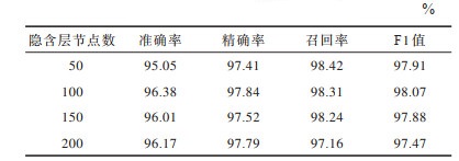 3.3.1 隐含层节点数的选择实验BGRU较BLSTM结构更简单且计算复杂度更低,其隐含层节点数对模型的复杂度和分类效果有一定的影响。本文基于样本API调用序列与网络行为的融合特征对模型进行训练,并通过选择实验得到隐含层节点数分别为50、100、150和200时本文模型的准确率、精确率、召回率以及F1值,结果如表 1所示。可以看出,当隐层结点数为100时,模型各指标均为最优,其原因是当隐层结点数过少时,网络不具有必要的学习能力和信息处理能力。当隐层结点数过多时,网络结构的复杂性大幅增加,网络在学习过程中更易陷入局部极小点且学习速度减慢。因此,本文设置隐含层节点为100。