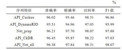 为进一步探究不同序列特征对模型分类性能的影响,本文基于BGRU模型进行消融实验,实验结果如表 2所示。可以看出,单独基于Cuckoo沙箱得到的API调用序列(API_Cuckoo)的分类效果比单独基于DynamoRIO系统得到的API调用序列(API_DynamoRIO)更好,将两者结合后,所得API_CkDR分类效果更好。将序列特征融入后形成API_Net_all,尽管准确率低于API_CkDR,但其精确率、召回率和F1分数都要高于API_CkDR。