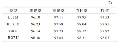 此外,本文将BGRU和BLSTM的时间复杂度进行对比,发现BGRU收敛速度较BLSTM更快。这是因为GRU参数较少,其更易收敛,且GRU的结构较LSTM更简单,因此BGRU的训练与测试时间均较BLSTM更短。从结构上来看,GRU只有2个门(update和reset),LSTM有3个门(forget,input和output),GRU直接将隐藏状态传给下一个单元,而LSTM则用记忆单元把隐藏状态包装起来。实际上,GRU和LSTM的性能在很多分类任务中较接近,但在本文实验中,由于引入更复杂的双向网络模型,GRU的高速收敛使得模型训练效果更优,因此GRU的检测性能要略优于LSTM。